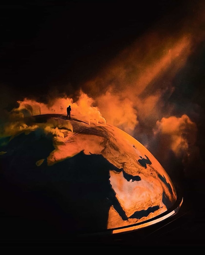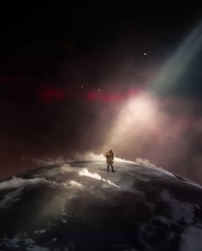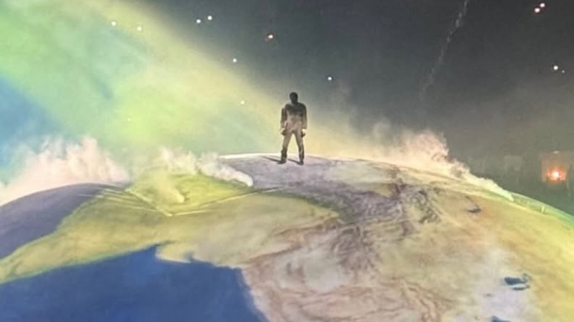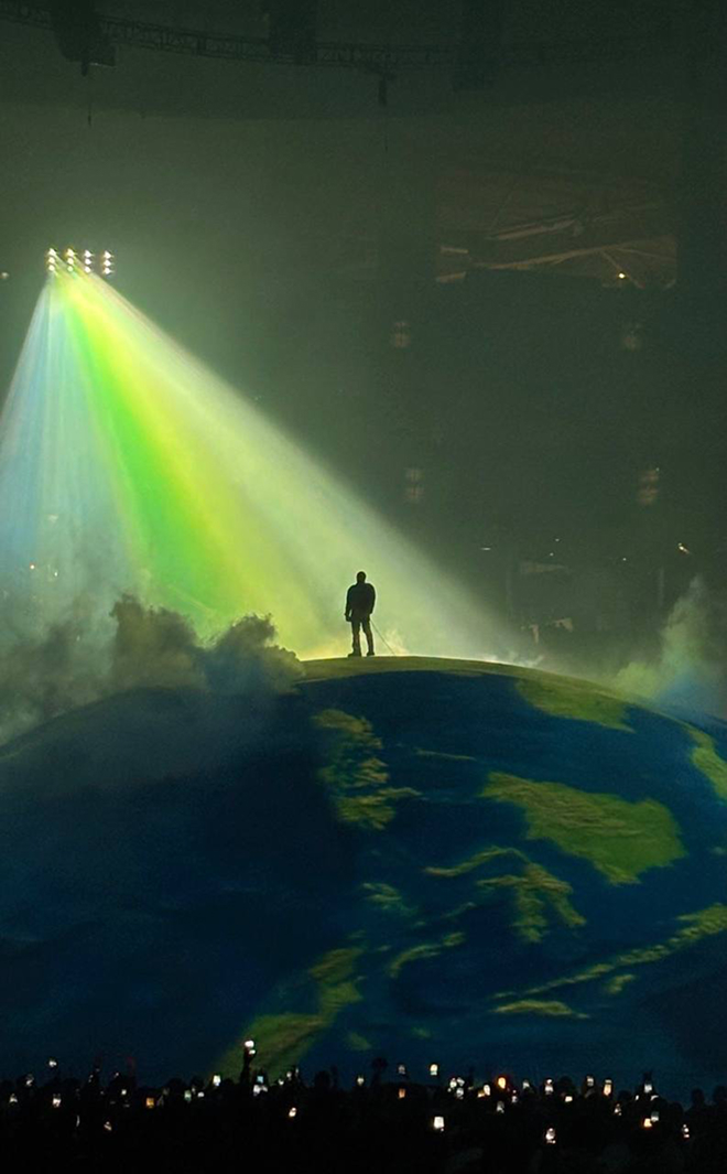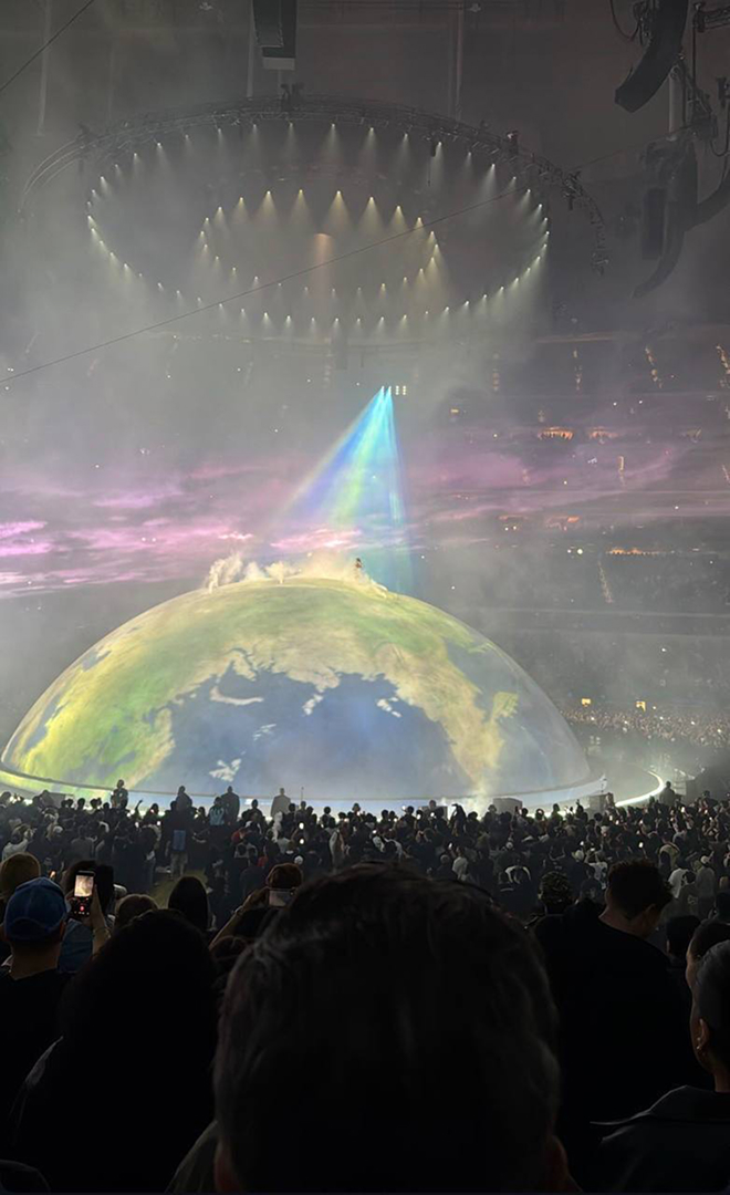 У Канье Уэста прошел концерт “Bully” в Калифорнии с потрясающей сценографией: в центре зала огромная полусфера, которая переодически освещалась как земной шар. Получается, что Канье — на вершине мира.