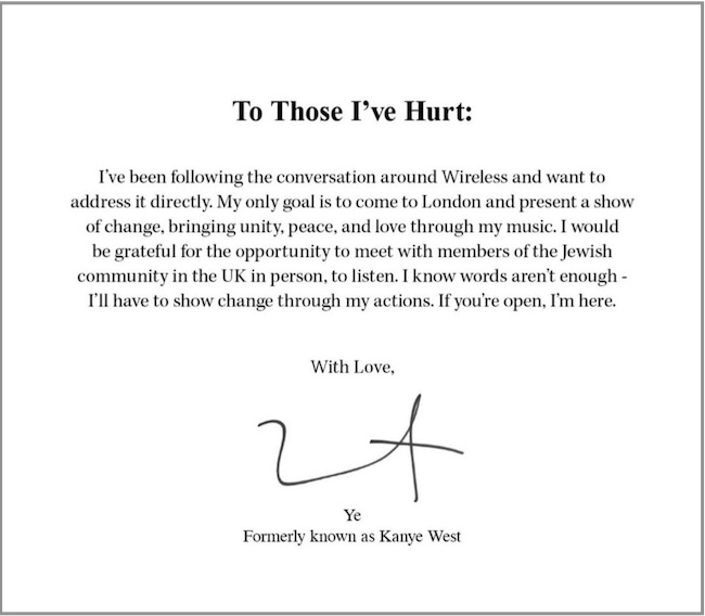 Ye опубликовал специальное обращение: "Тем, кого я обидел. Моя единственная цель — приехать в Лондон и представить шоу перемен, принося единство, мир и любовь через мою музыку. Я был бы благодарен за возможность встретиться лично с членами еврейской общины Великобритании, чтобы выслушать. Я знаю, что слов недостаточно — я должен показать перемены через свои действия. Если вы открыты, я готов".