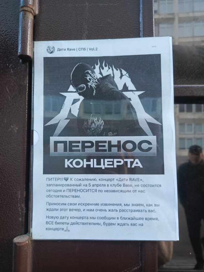 Концерты Дети Rave, запланированные на 4 апреля в Москве и 5 апреля в Санкт-Петербурге, не состоялись. В соцсетях клуба Base, где должны были пройти шоу в обеих столицах, появились посты о том, что выступления перенесены "по независящим от клуба обстоятельствам". “Меня НЕ будет на ближайших концертах”, — написал в телеграм-канале основатель проекта Дети Rave Илья Бурков.