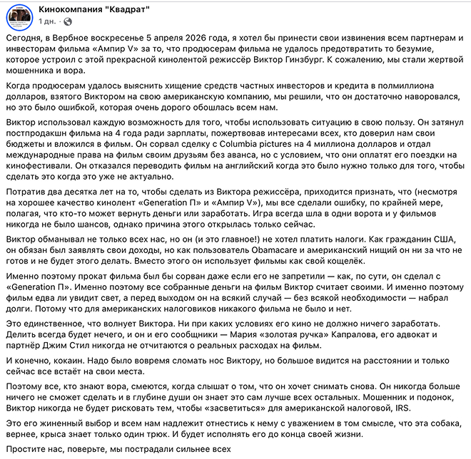 В аккаунте кинокомпании “Квадрат” появился негативный пост в адрес Виктора Гинзбурга, режиссера фильма “Ампир V”. “Квадрат” извиняется перед инвесторами за то, “что продюсерам фильма не удалось предотвратить то безумие, которое устроил с этой прекрасной кинолентой режиссер Виктор Гинзбург”.