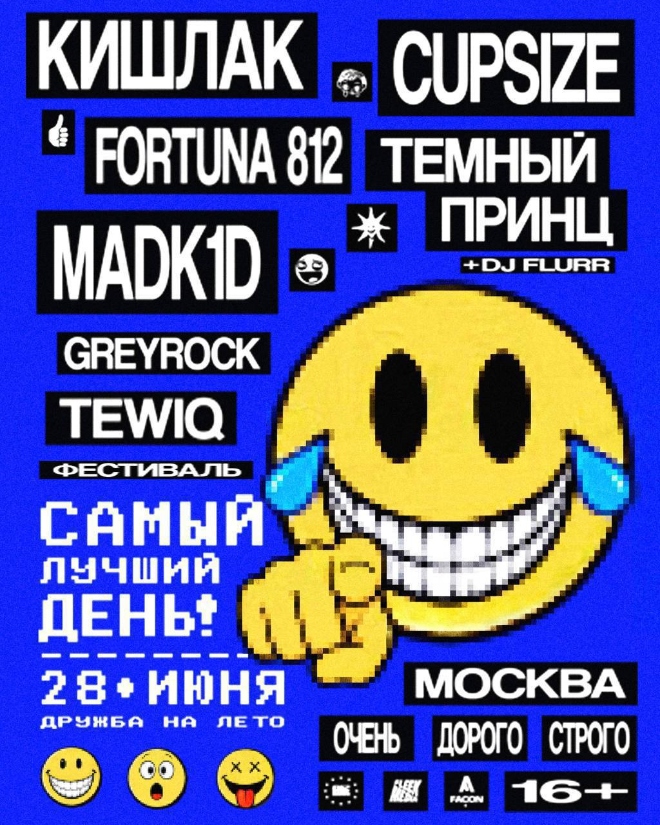 Анонсирован фестиваль “Самый лучший день!”. Его участники — звезды саундклауд-сцены и популярные околонефорские артисты. Лайнап такой: Madk1d, Fortuna 812, Cupsize, Кишлак, Темный принц, Greyrock, Tewiq.