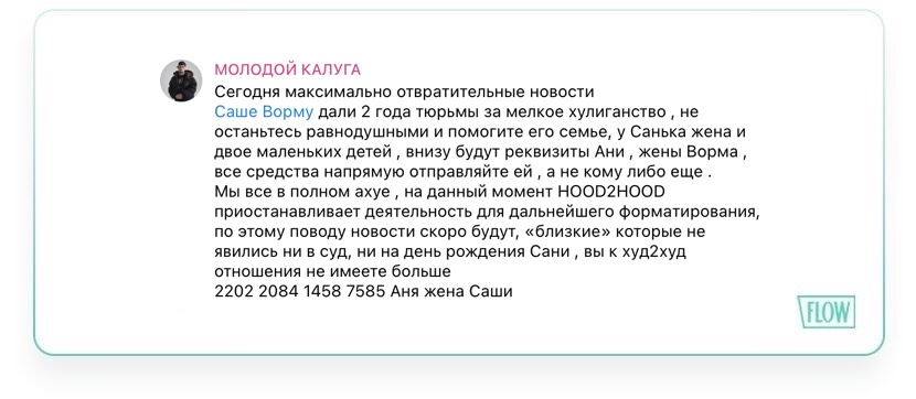 Об этом написал бывший участник крю и давний друг Ворма, Молодой Калуга: "Мы все в полном ахуе, на данный момент Hood2Hood приостанавливает деятельность для дальнейшего форматирования, по этому поводу новости скоро будут. "Близкие", которые не явились ни в суд, ни на день рождения Сани, вы к Hood2Hood отношения не имеете больше. <...> Не останьтесь равнодушными и помогите его семье, у Санька жена и двое маленьких детей".